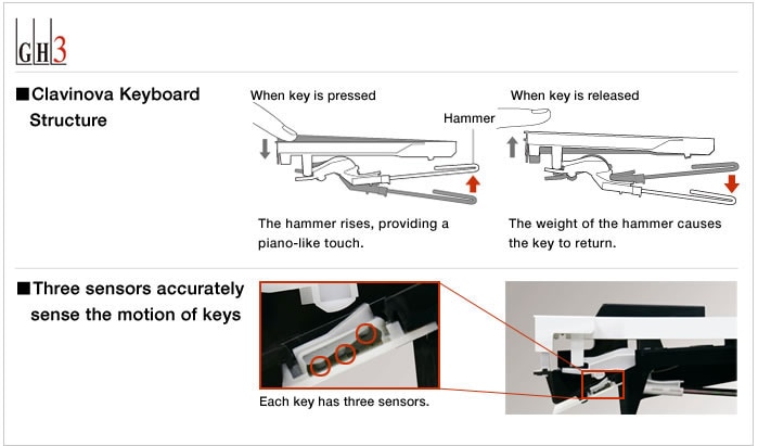 O toque do teclado Clavinova tem sido elogiado pelos pianistas por uma sensação de performance que o faz esquecer que se trata de um piano digital. O segredo por detrás deste toque superior é o mesmo sistema de martelos e mecanismo sem molas igual ao do piano de cauda. Dependendo do peso do martelo, a força do seu toque e o retorno natural da tecla quando a liberta, o Clavinova reproduz fielmente o toque de teclado de um piano acústico de uma sensação pesada na amplitude dos graves para a sensação leve na gama dos agudos. Também é muito importante o sistema de três sensores único da Yamaha, que capta e interpreta de forma precisa o comportamento do teclado, tal como um piano de cauda. Quando se toca continuamente ou com um ligeiro trilo, técnicas utilizadas em muitas peças como a “Für Elise”, pode tocar com um sentimento brilhante e vívido.