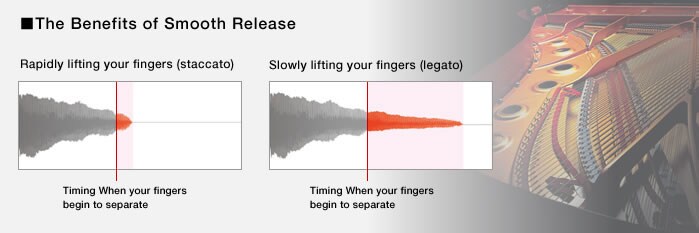 O Clavinova usa o motor de som RGE (Real Grand Expression), a fonte sonora de piano da próxima geração. Isto permite-lhe desfrutar da resposta de execução e capacidade expressiva de um piano de cauda de concerto. Apresenta a nova função Smooth Release, que consegue expressar som com grande claridade, e articula claramente as notas staccato com o som da ressonância prolongada que se ouve quando se levantam suavemente os dedos das teclas. Tem sucesso em captar a essência de uma performance de piano para criar experiências semelhantes ao piano de cauda, abundantemente expressivas.