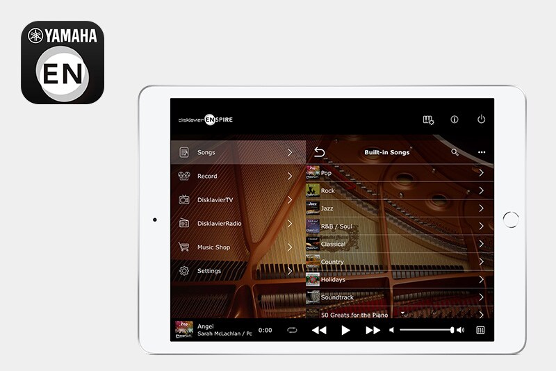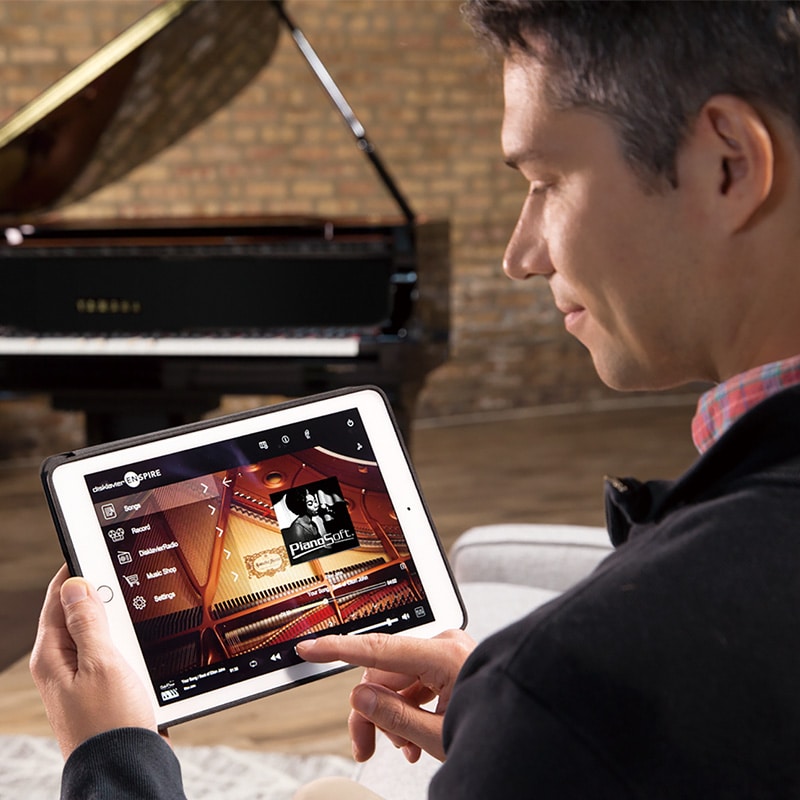 A aplicação ENSPIRE Controller (para iOS ou Android) permite a ligação do Disklavier a um smartphone ou tablet. Através da aplicação, é fácil selecionar e descarregar músicas ou gravar as performances próprias.