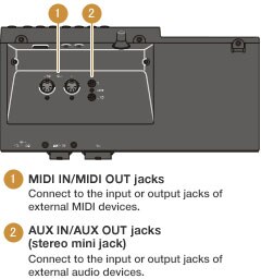- AUX and MIDI terminals allow the sound to be output to a variety of external devices (e.g. stereo components, IC recorders, speakers with built-in amplifiers, stereo systems).